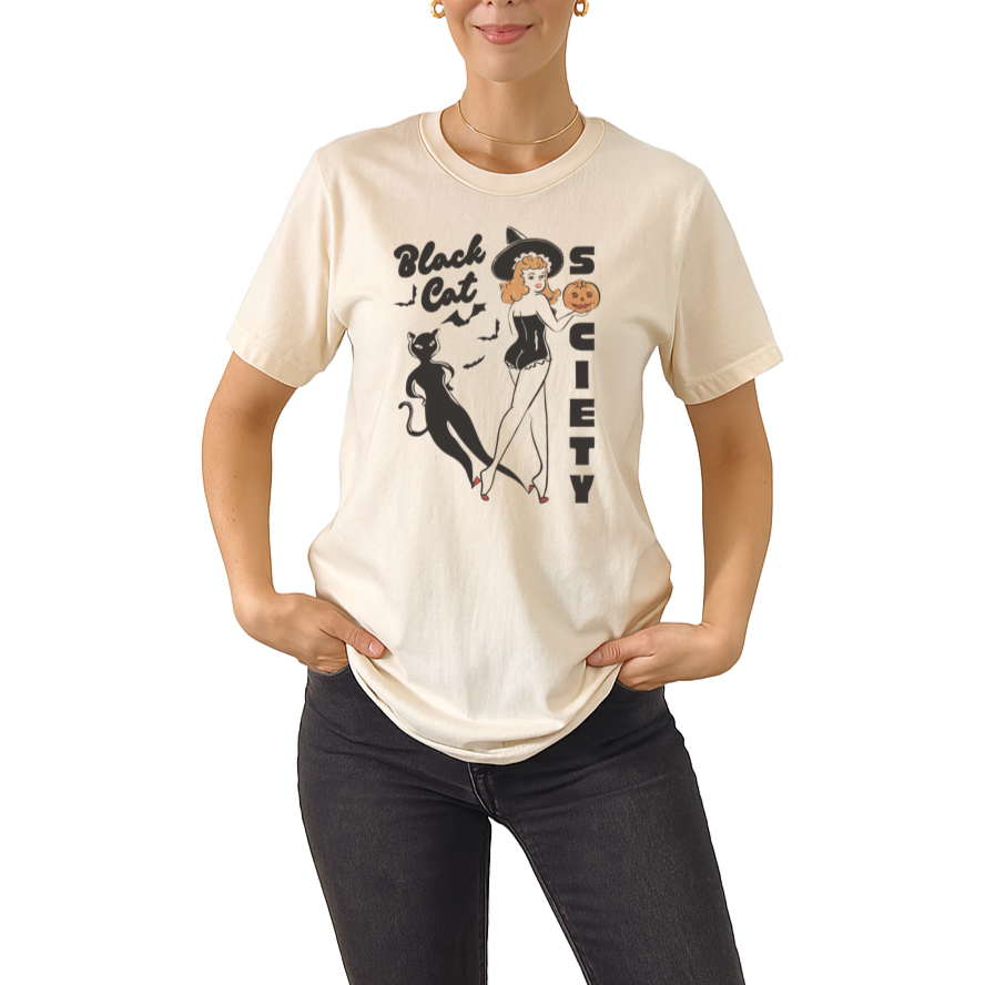 Join the Black Cat Society and celebrate spooky season in vintage style. This retro-inspired Halloween t-shirt brings together classic pinup vibes and timeless Halloween charm, perfect for cat lovers and fans of all things mysterious and magical.