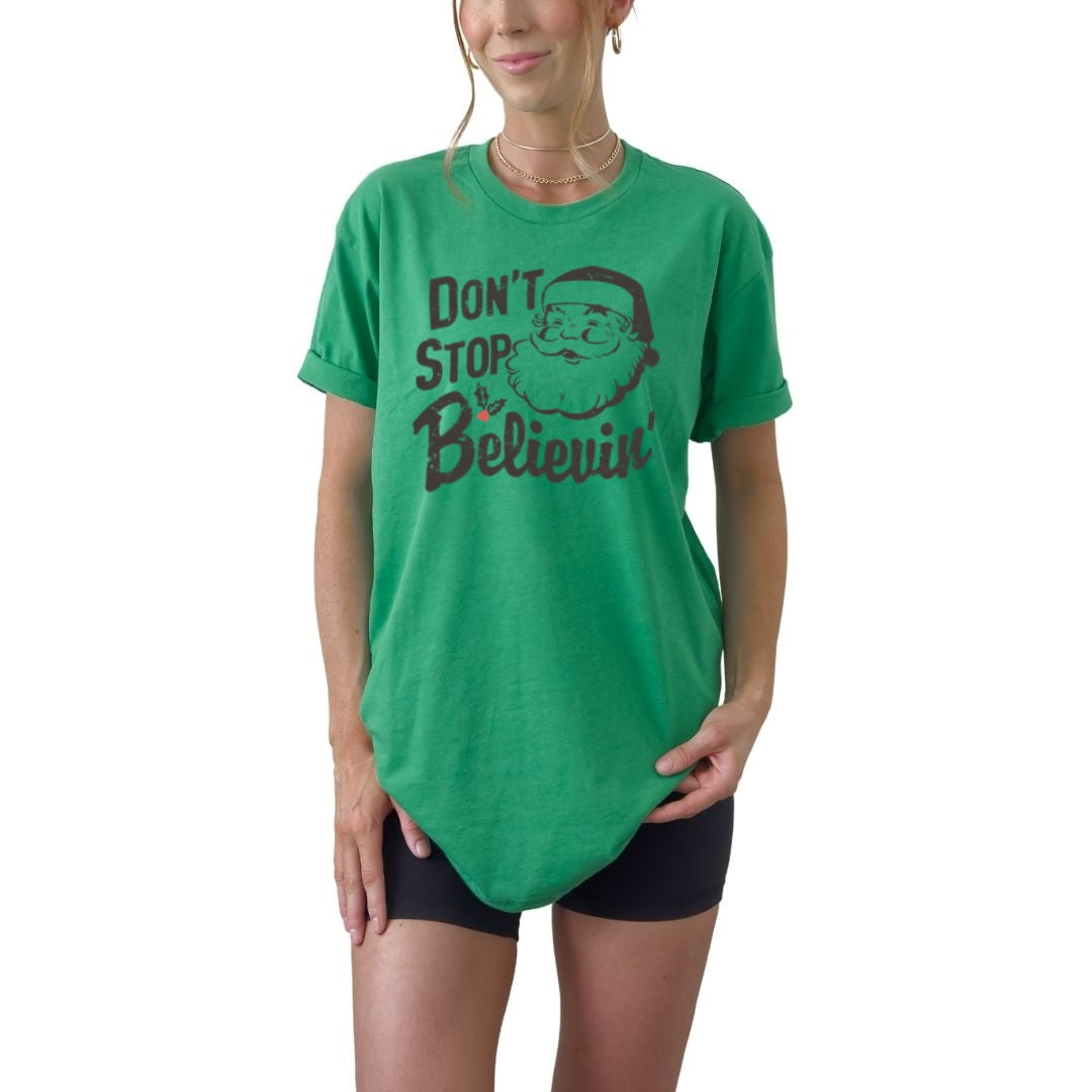 Spread holiday cheer with this playful Don't Stop Believing retro Santa tee! Perfect for Christmas parties, family gatherings, and anyone who loves vintage holiday vibes.